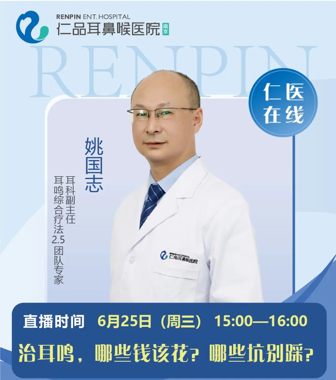 本周三,“仁医在线”直播间将邀请南京仁品耳科副主任、耳鸣综合疗法2.5团队专家姚国志,带您直击耳鸣治疗的核心:如何通过精准检查锁定问题,运用规范疗法——耳鸣综合疗法2.5有效管理耳鸣。这场“耳鸣治疗坦白局”将直接告诉您:哪些钱该花?哪些坑千万别踩!帮您科学管理耳鸣,告别无效治疗!