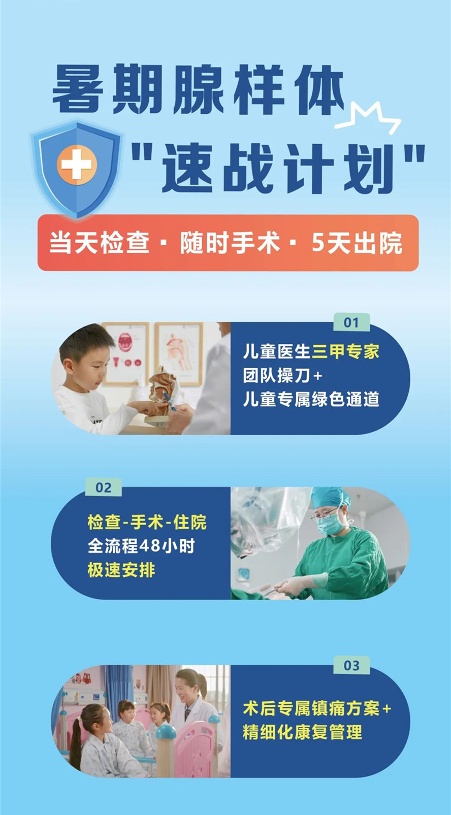 医生:别担心!我院开通了“暑期儿童腺样体手术绿色通道”,检查、手术、住院,全流程48小时极速安排,5天即可完成治疗、康复出院!